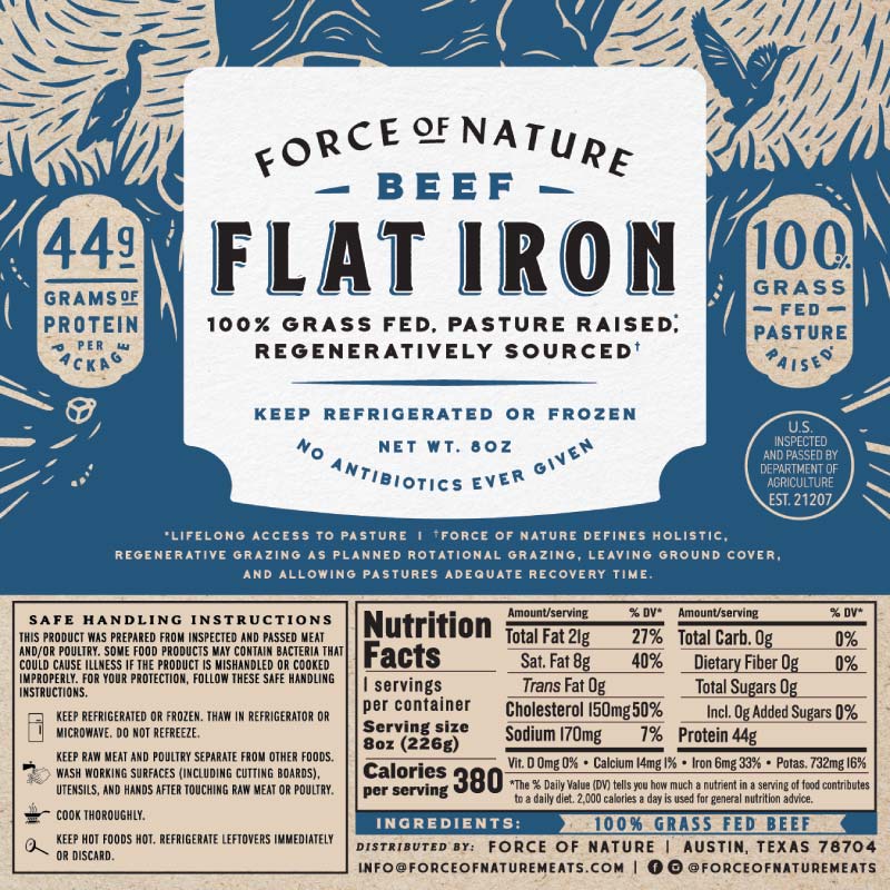 The 100% grass-fed and grass-finished flat iron is a tender cut from the shoulder with beautiful lacy marbling. It’s the perfect steak for a quick and easy sear, giving it a nice crust that will complement its rich and velvety texture–similar to tenderloin. Whether you’re looking for a last minute weeknight meal or something to impress on date night, this grass-fed flat iron is as tender and melt-in-your-mouth as it gets.